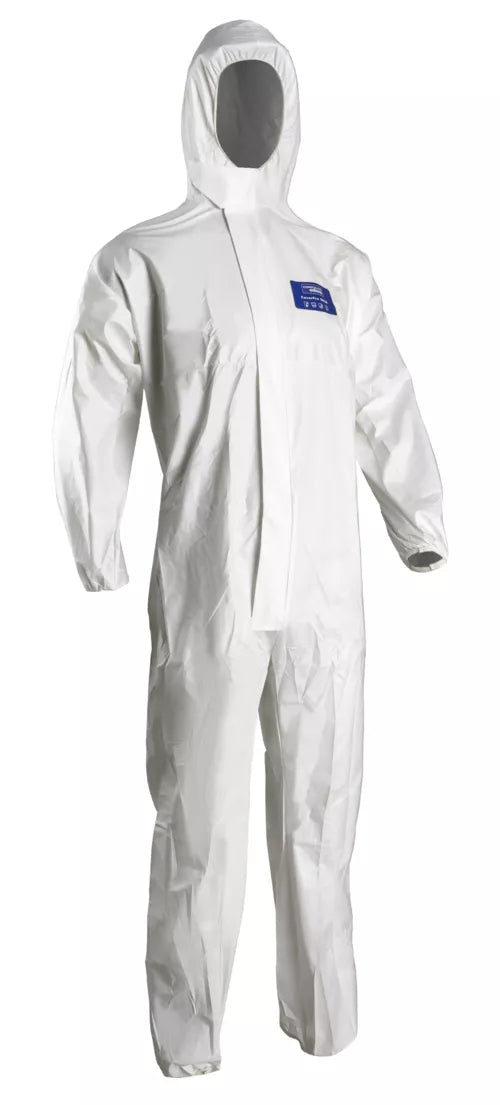 * Combinezon din polipropilenă albă, microporosă, cu glugă, grosime de 55 g / m2, de înaltă rezistență, ventilată și fără silicon * protejează împotriva stropilor de praf și lichide și spray-uri, cu proprietăți antistatice * fermoar cu clapă de protecție autoadezivă, elastic, încheietura mâinii și gleznei, elastic la degetul mare * categoria III. de protecție, tip 5 și 6