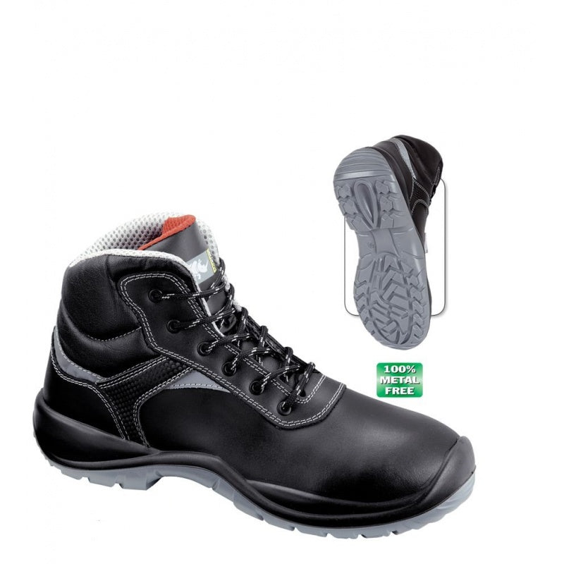 Bocanci de protectie BUSENTO-CALIMANU S3 WR SRC,METAL- FREE, cu fete din piele de bovină, netedă şi hidrofobizată, cu ornament reflectorizant cu bombeu nemetalic din material compozit, rezistent la şoc 200J şi compresiune si lamela antiperforaţie nemetalică, perforaţie zero.