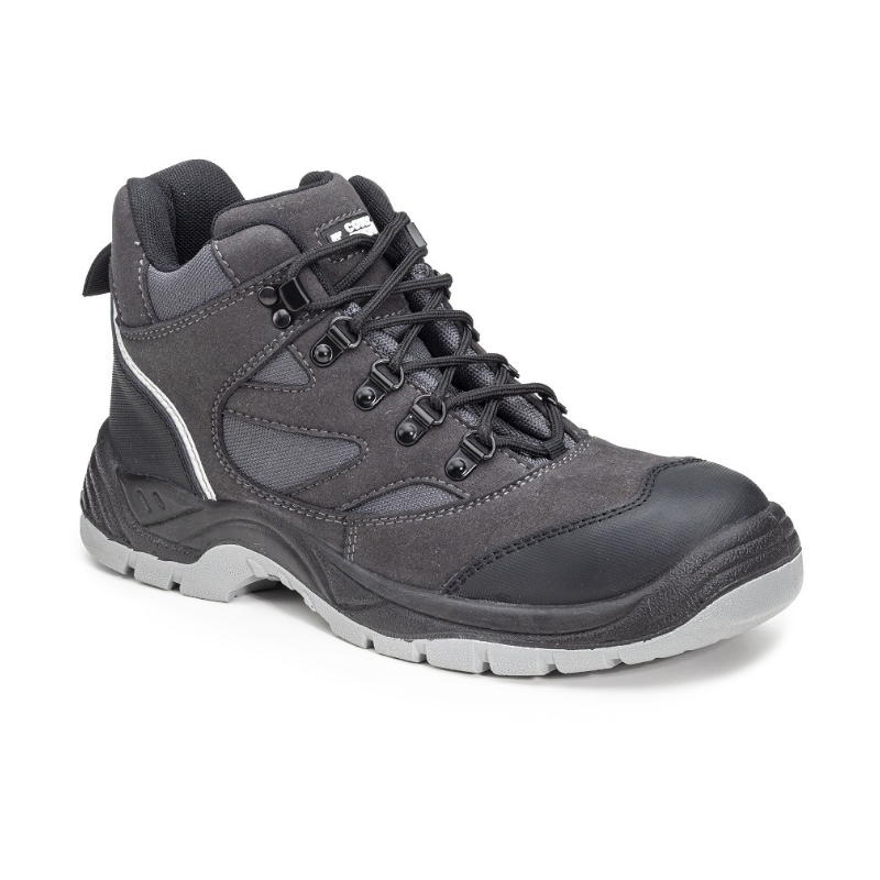 Incălțăminte de protecție din piele suede, de culoare negru – antracit, respirabilă și impermeabilă, cu inserții textile gri. Varful și tocul sunt acoperite cu textil rezistent la abraziune, plus bandă ornamentală reflectorizantă în partea din spate. Bombeu de protecție din oțel, împotriva obiectelor în cădere și lamelă de oțel în talpă împotriva perforării. Talpă din PU dublă densitate, antistatica, rezistentă la uleiuri, cu proprietati SRC avansate, testate pe ceramica umeda si otel. Căptușeală