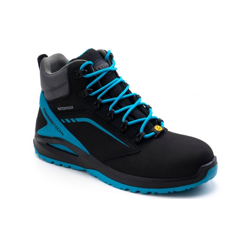 Bocanci din piele naturala neagră hidrofobizata, cu membrană respirabilă si impermeabilă, cu inserții albastru verzui, piele căptușită gri în zona gleznei. Căptușeala gri si albastru verzui cu tehnologie anti-miros R-DRY, limbă căptușită, bombeu de protecție din fibră de sticlă, lamelă nemetalică, branț în formă anatomică cu absorbitor din gel în călcâi, detașabil, respirabil si antistatic.
