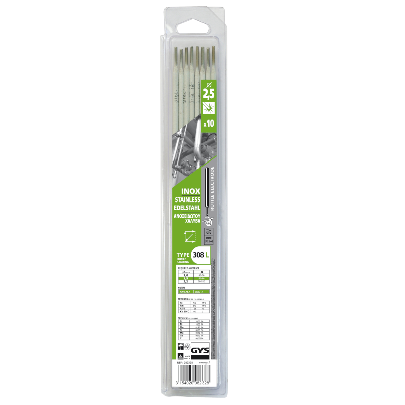 Electrod bazic rutil cu o concentrație foarte scăzută de carbon, proiectat pentru oțeluri inoxidabile austenitice fără molibden, tip 18/8 (304, 304L). Este foarte rezistent la coroziune în medii oxidante și poate fi utilizat în toate pozițiile. Este recomandat pentru prima trecere, în toate cazurile în care sunt necesare penetrare regulată și compacitate.
