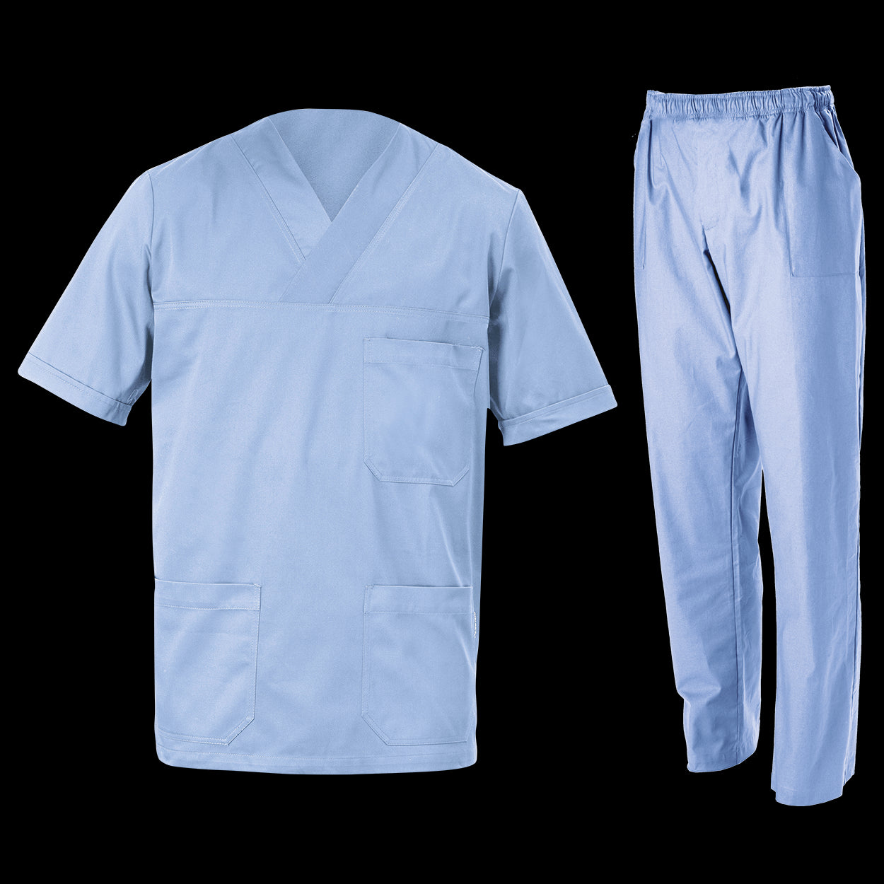 Set tunica cu pantaloni - model unisex potrivit atat pentru femei, cat si pentru barbati. Tunica: � model drept; � maneca scurta; � decolteu in forma de V; � fante laterale pentru confort; � trei buzunare - doua inferioare si unul din partea stanga pieptului. Pantaloni: � model drept; � elastic in talie; � doua buzunare frontale, exterioare. MATERIAL: 65% poliester/35% bumbac, 120 g/m�.