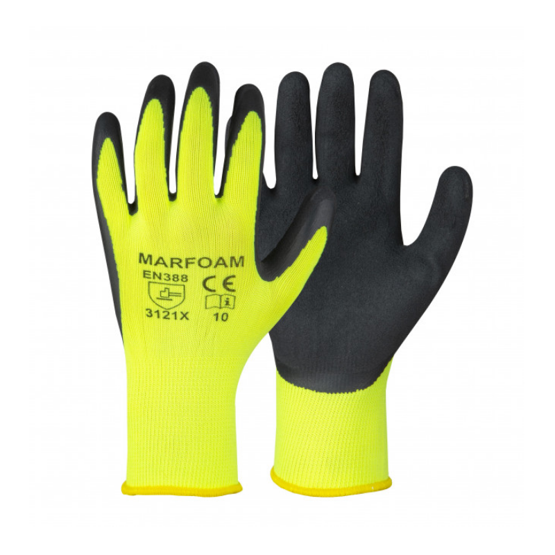 Manusi de protectie BACFOAM tricotate din nylon, palmă şi parţial degetele imersate în latex negru, microporos permeabil la aer, manşetă elastică.