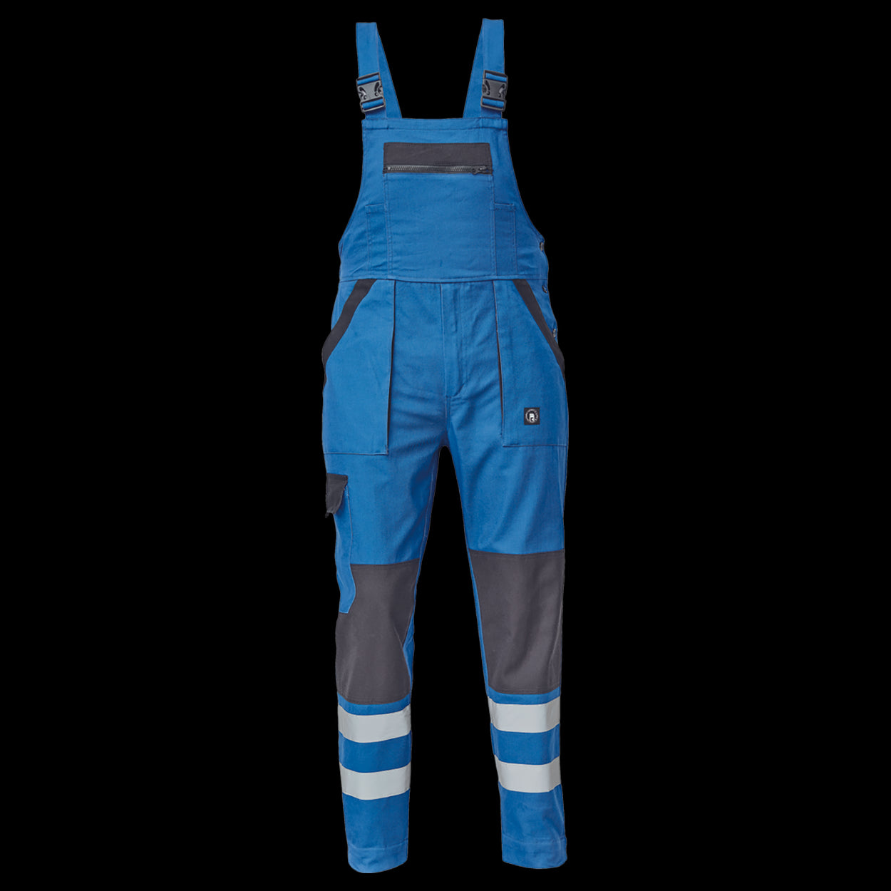 � doua buzunare laterale, externe; � doua buzunare la spate - unul cu husa; � un buzunar pentru scule cu clapeta pe coapsa dreapta; � un buzunar la piept cu fermoar; � inchidere elastica in talie; � prindere din partea stanga cu nasturi; � bretele elastice, reglabile; � genunchi intariti; � benzi reflectorizante largi. Material: 100% bumbac, 260 g/m�