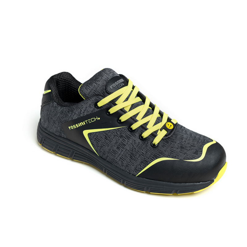 Pantofi de protecție ușori, doar 440 grame, din țesătură exclusivă High Tenacity respirabil gri cu aplicații flourescente galbene. Captuseala interioară anti-miros R-DRY, de culoare neagră cu elemente galben flourescent, limbă căptușită, bombeu ultraușor din fibră de sticlă, lamelă antiperforatie nemetalică, ultraușoară, branț detașabil, respirabil, anti-static în formă anatomică, cu absorbitor de șoc din gel în călcâi.