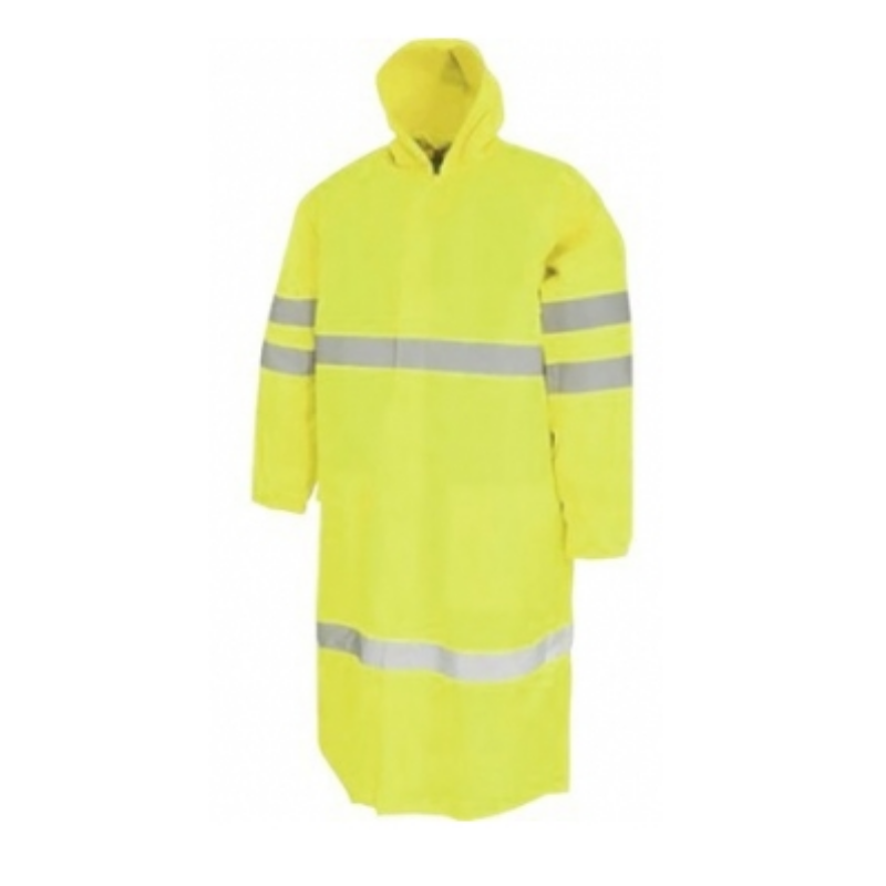 Pelerină din fâş peliculizat cu benzi reflectorizante.