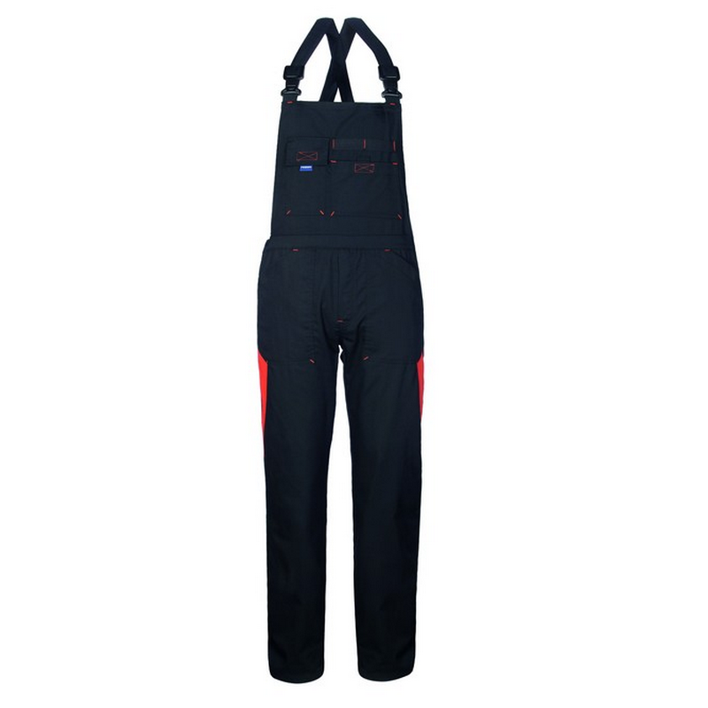 Salopete de lucru cu pieptar, cu bretele cu elastic intern, închizătoare la șliț și fermoar. Un buzunar și un suport pentru telefon pe piept, două buzunare frontale aplicate, un buzunar posterior aplicat în dreapta, cu închizătoare cu clapă și scai, un suport pentru metru pe piciorul drept. Elastic pe talie în spate, deschizătură laterală în partea dreaptă închisă cu nasturi, protecție pentru rinichi cu elastic interior, inserții întărite și cusături de culoare contrastantă.