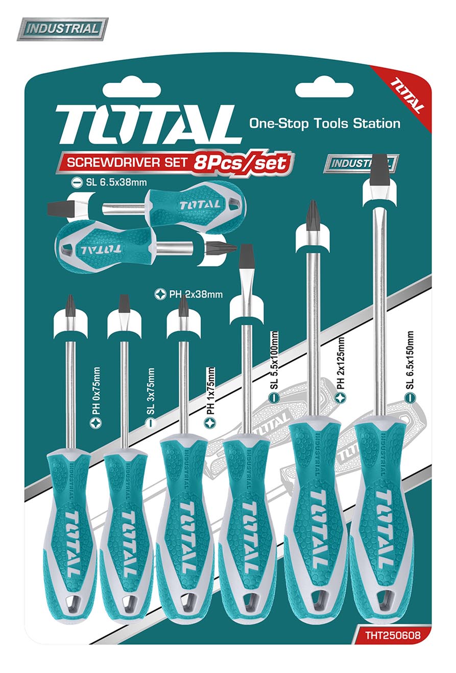 Set șurubelnițe 8 buc Material: CR-V 1 buc SL3.0 * 3 * 75 1 buc SL5.5 * 5 * 100 1 buc SL6.5 * 6 * 150 1 buc SL6.5 * 6 * 38 1 buc PH0 * 3 * 75 1 buc PH1 * 5 * 75 1 buc PH2 * 6 * 125 1 buc PH2 * 6 * 38